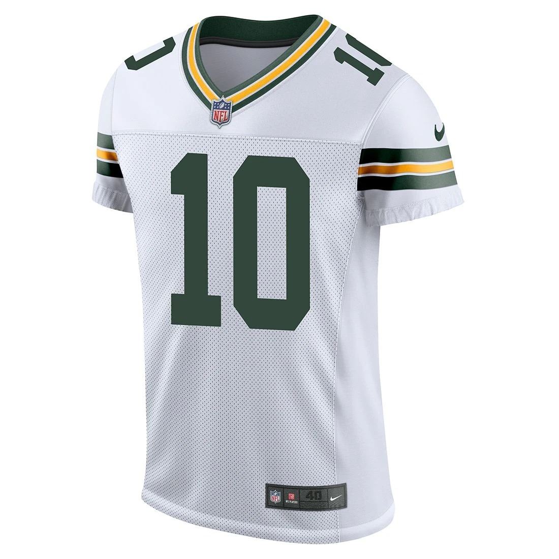 The Green Bay Packers Nike Elite Jersey is the retail version of the on-field jersey the Team wears. Includes elasticized sleeve cuffs and metallic NFL Shield at neckline. Engineered and constructed with similar attributes as those worn on the field. Designed for the fan who wants to look and feel like a Pro! Has total comfort and movement with strategic ventilation that provides breathability. Jersey has a tailored fit, and is made of a nylon/spandex mesh body and has ribbed knit v-neck taping of green and gold stripes. Tackle twill numbers and letters are sewn on for authenticity. Jock tag on lower left front.