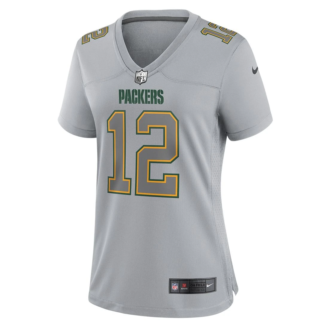 Nike Atmoshpere light gray fashion game jersey features printed gray player name and number with team color outlines. Has black and white NFL shield at v-neck and printed team wordmark. Strategic ventilation for breathability and printed numbers and letters provide a light and soft feel. Woven jock tag at front left hem. Polyester.