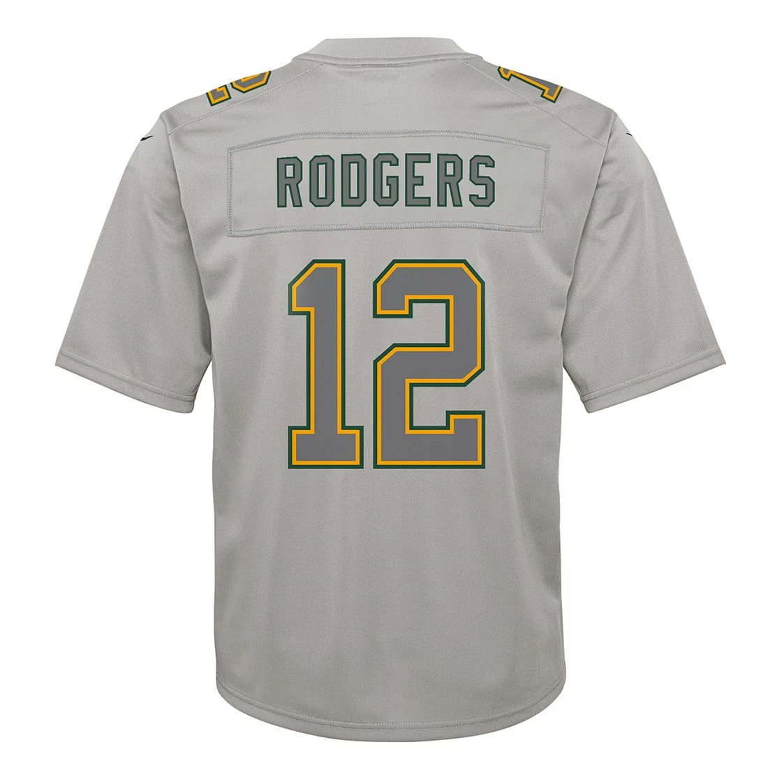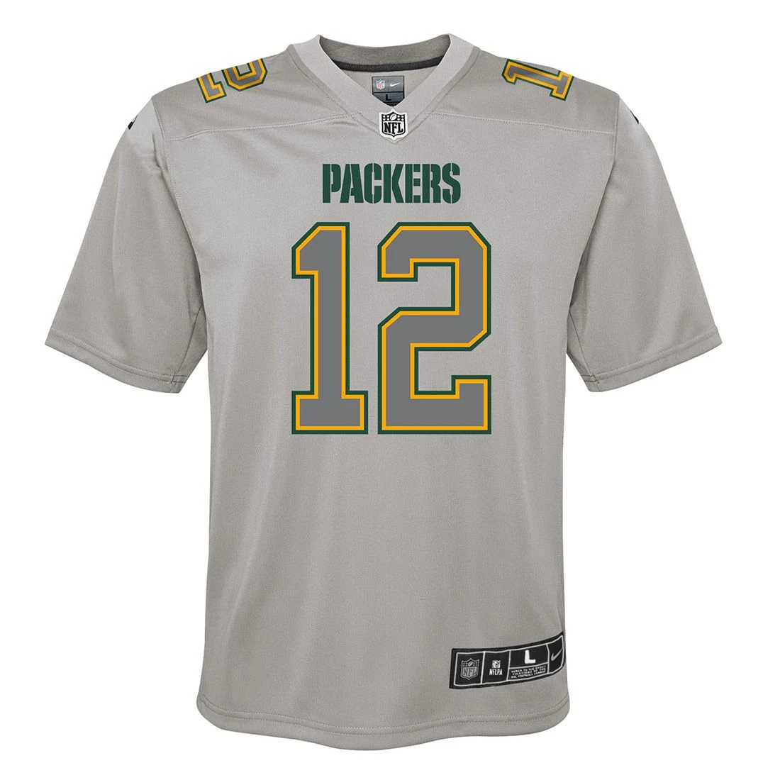 Nike atmosphere light gray fashion game jersey features printed gray player name and number with team color outlines. Has black and white NFL shield at v-neck and printed team wordmark. Strategic ventilation for breathabilility and printed numbers and letter provide a light and soft feel. Woven jock tag at left hem. Polyester.