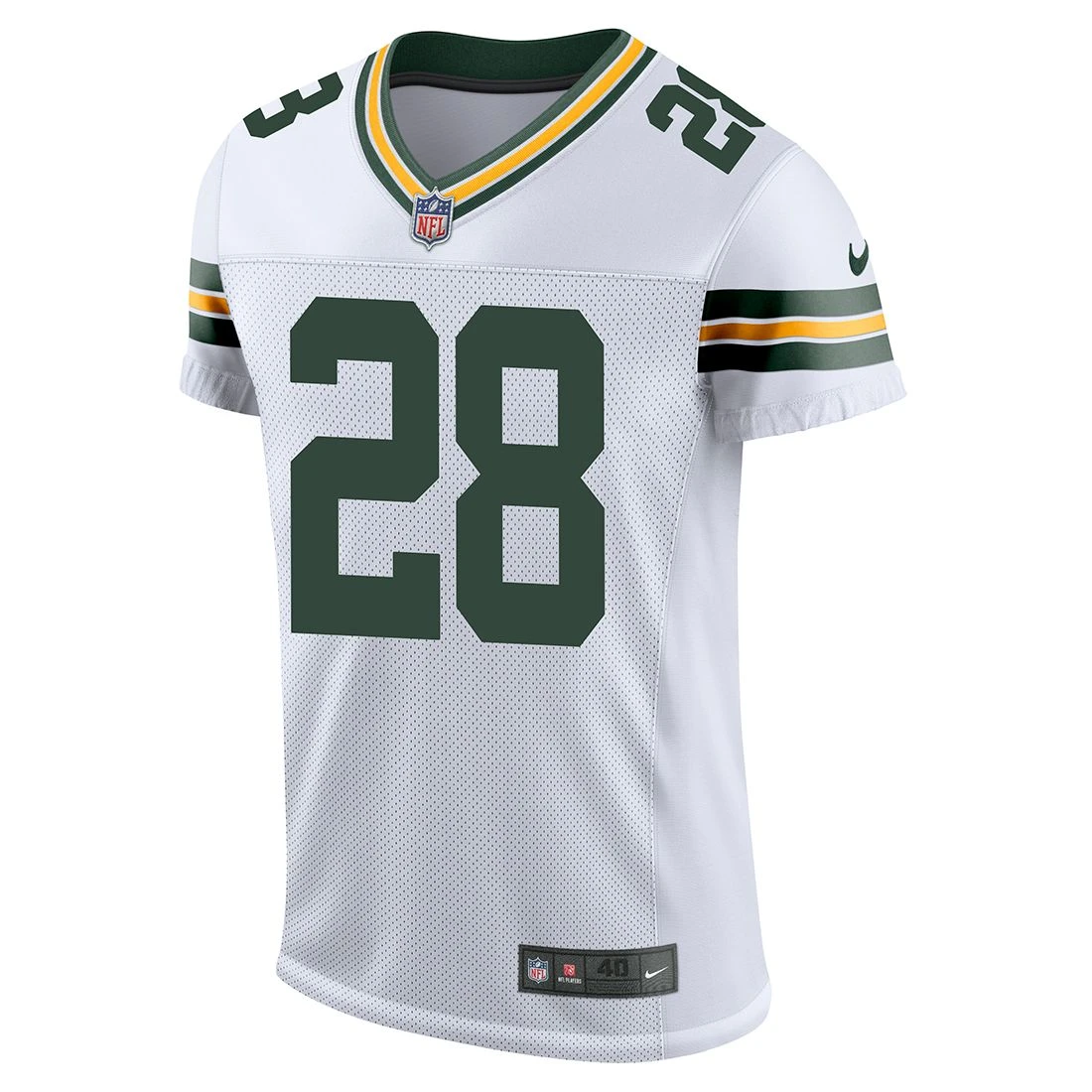 The Green Bay Packers Nike Elite Jersey is the retail version of the on-field jersey the Team wears. Includes elasticized sleeve cuffs and metallic NFL Shield at neckline. Engineered and constructed with similar attributes as those worn on the field. Designed for the fan who wants to look and feel like a Pro! Has total comfort and movement with strategic ventilation that provides breathability. Jersey has a tailored fit, and is made of a nylon/spandex mesh body and has ribbed knit v-neck taping of green and gold stripes. Tackle twill numbers and letters are sewn on for authenticity. Jock tag on lower left front.