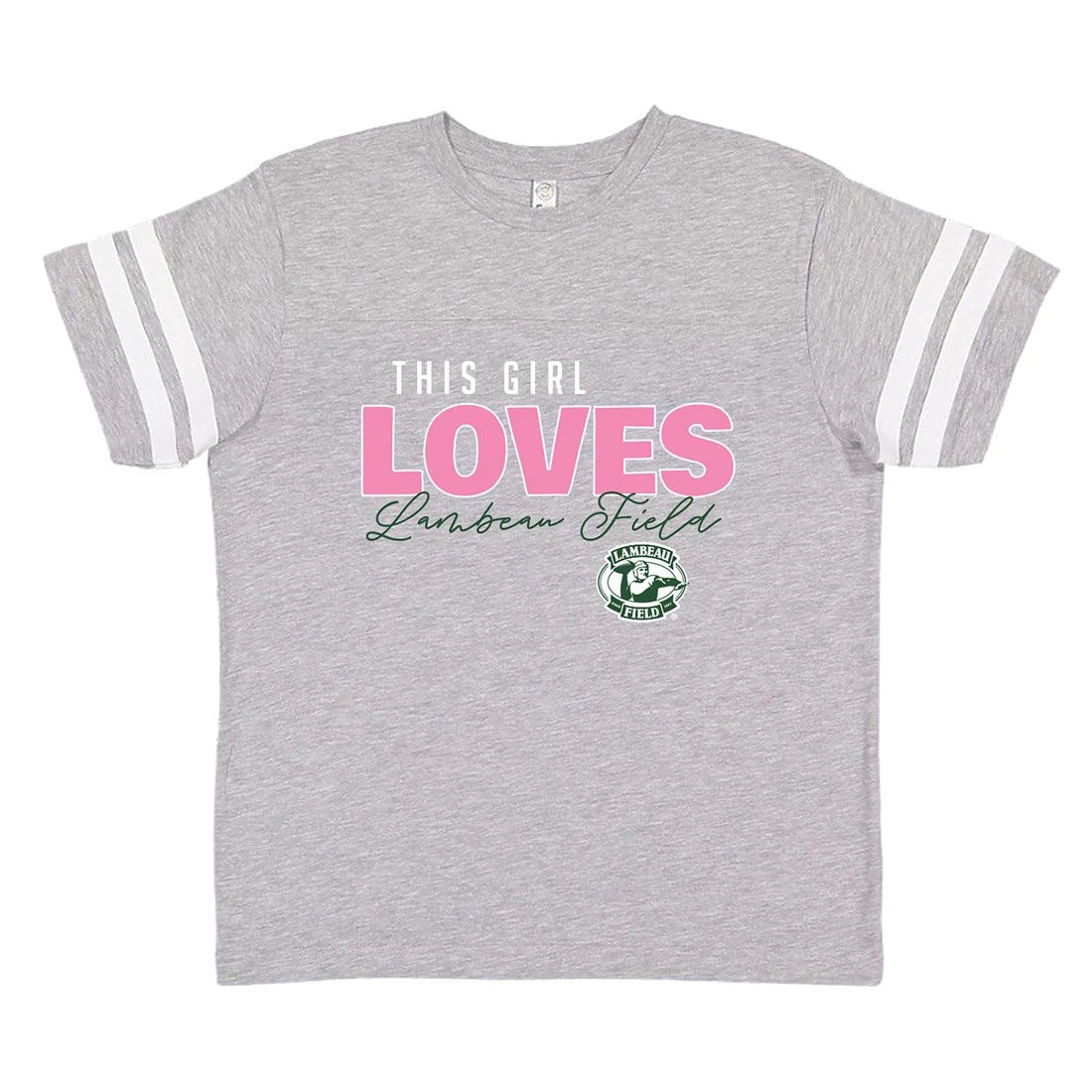 Who doesn’t love Lambeau Field? Short sleeved cotton/polyester t-shirt has cut and sew stripes on sleeves and printed graphics. From College Kids.