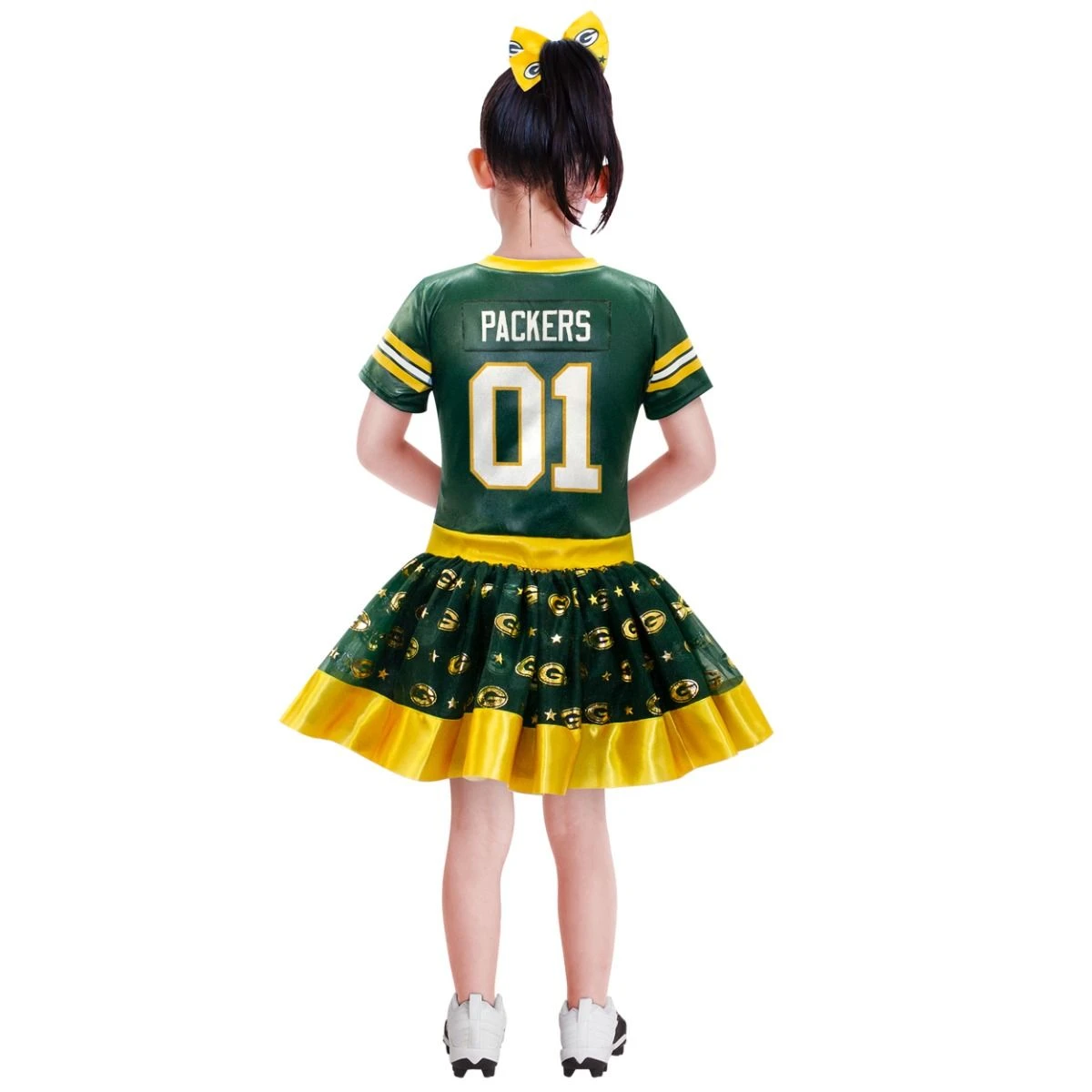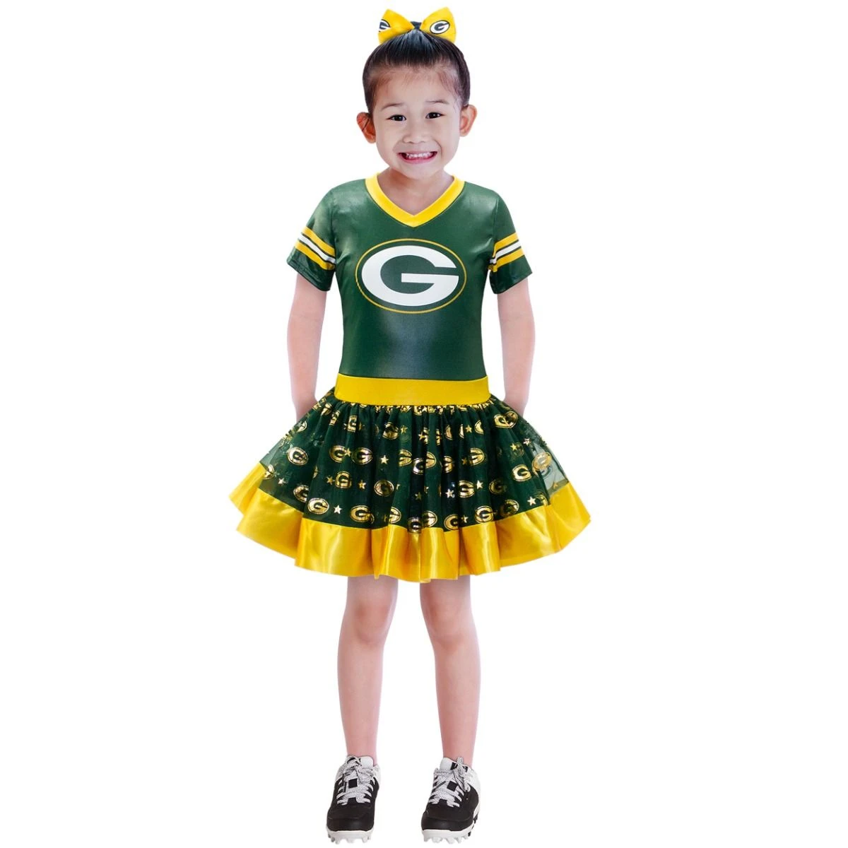 Playing dress up or planning your younger Packers fan’s Halloween costume just easier with this dress & bow set. Features a short sleeved v-neck top that mimics a jersey, and a lined tulle tutu skirt with metallic printed design and satin trim. Also comes with hair bow with sublimated graphics. Polyester. From Jerry Leigh.