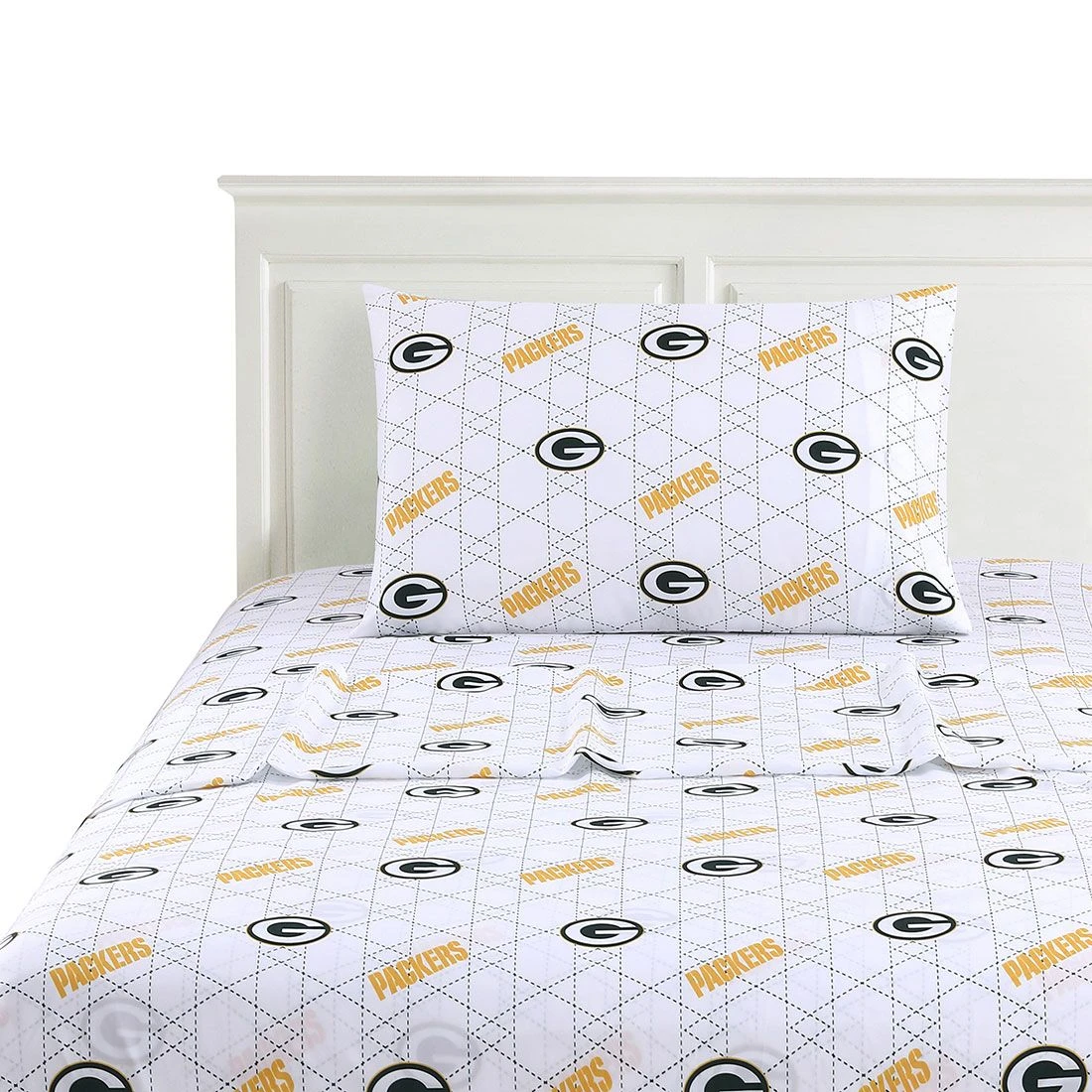 Step up your bedding game and indulge your team spirit with this finely crafted Green Bay Packers ‘Commander’ Sheet Set. Relive the victories every night with sheets printed with the iconic Packers logo on wrinkle-resistant, double brushed microfiber polyester. Set includes one flat sheet, one fitted sheet and a 30″ x 20″ pillowcase (Twin set has one; Full and Queen sets have two). All-around elasticized fitted sheet with a 14″ deep-pocket. Machine washable.