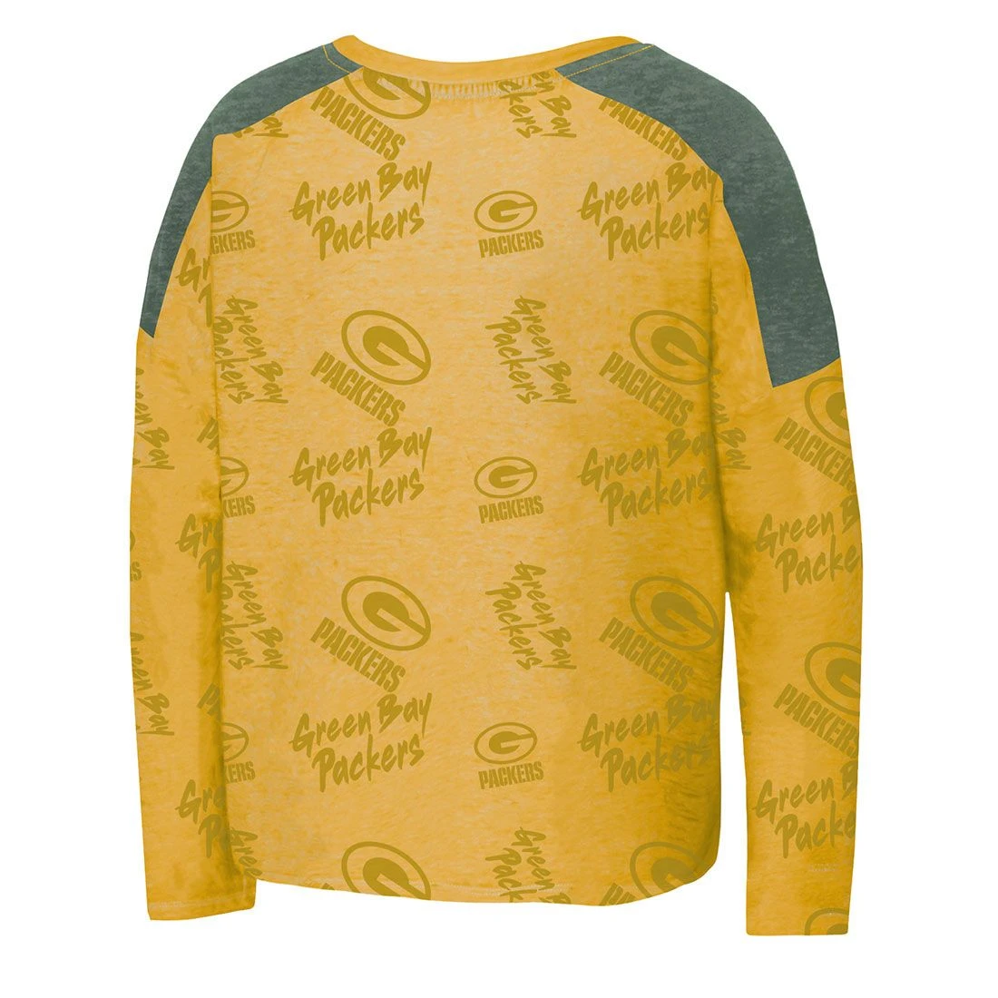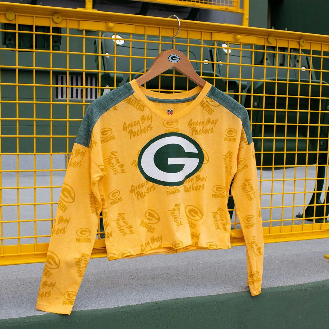 Rep the Packers in a stylish long sleeved cropped v-neck t-shirt from Outerstuff. Has heathered shoulder stripes, sublimated print, and raw edge hem. Cotton/polyester with printed graphics.