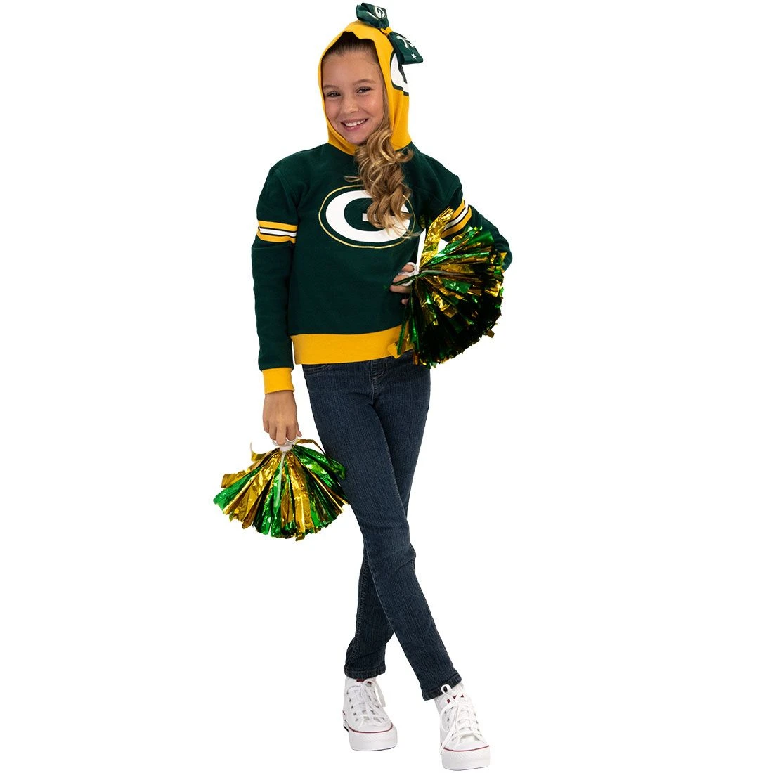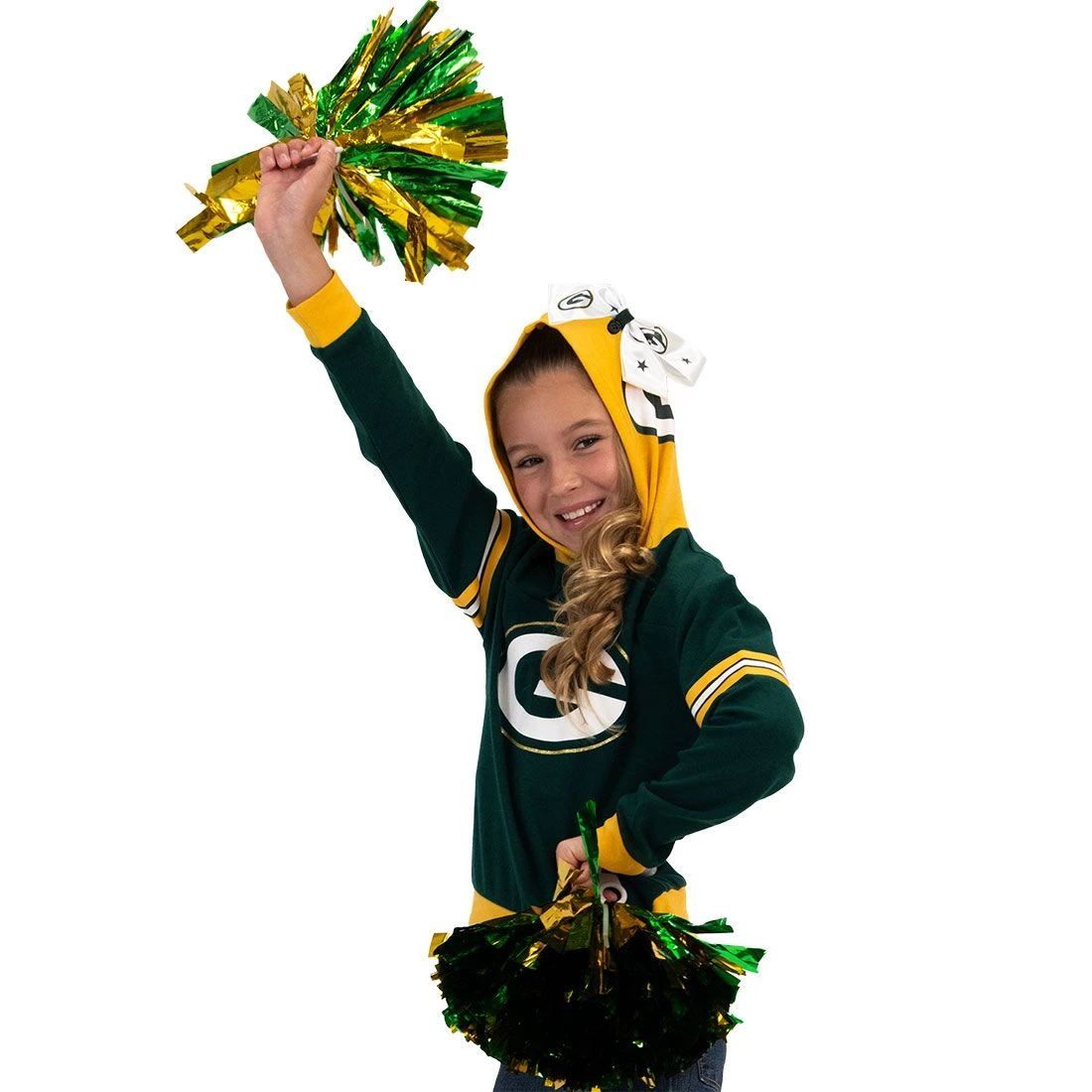 Cheer on the green and gold in a big way with this hoodie & bows set from Jerry Leigh. Tri-blend pullover hoodie has button on one side of the hood to attach one of three included bows, and has glitter accented printed graphics. Also comes with two metallic poms. Cotton/polyester/spandex.