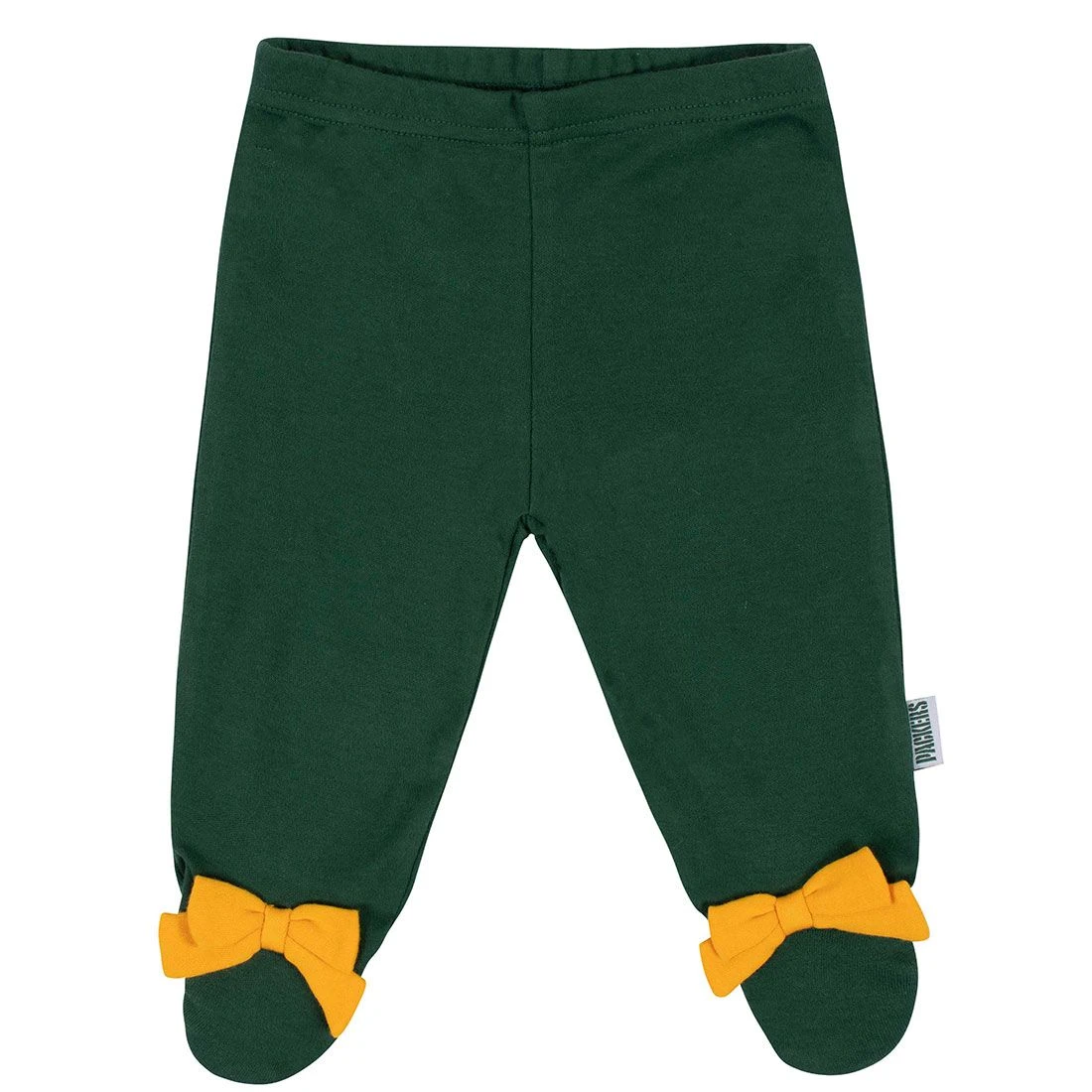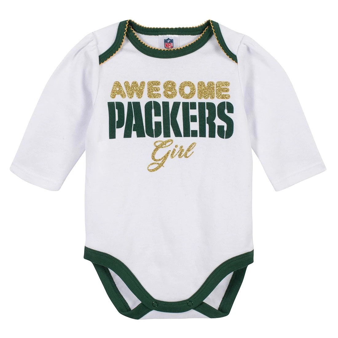 The perfect set for your newest Packers fan. Bodysuit has foldover neckline with contrast stitch trim, snap bottom, and printed graphics with gold glitter accents. Cap and footed pant have contrast team color bows, and woven team wordmark labels. Cotton/polyester. From Gerber.