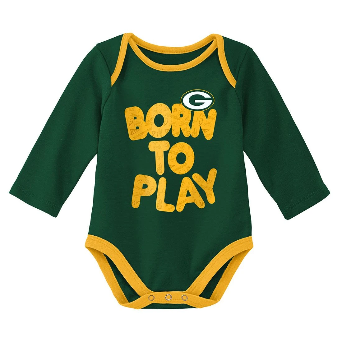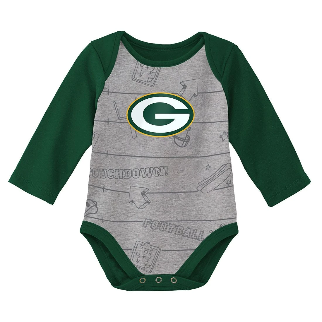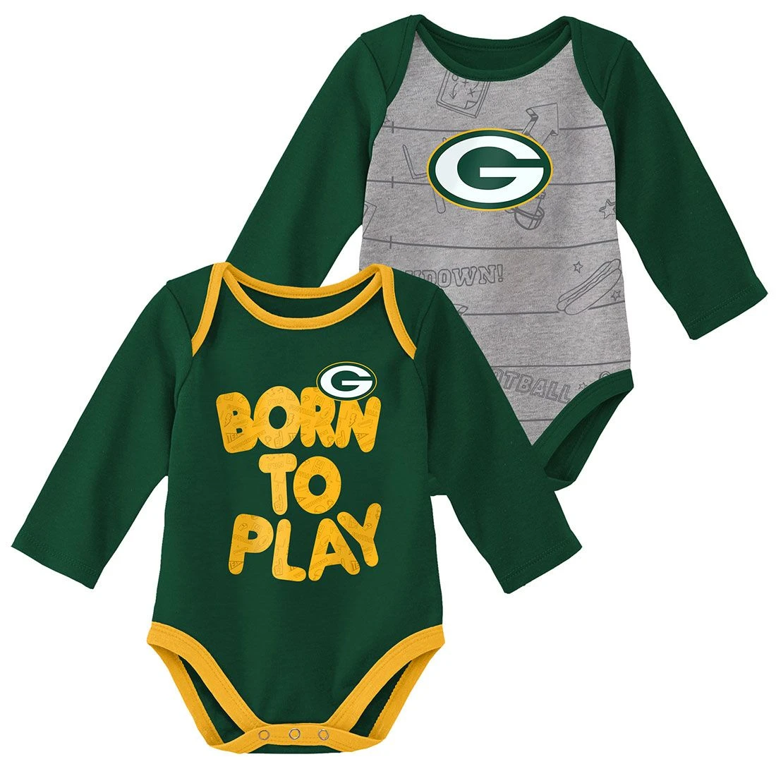 Get your tiny Packers supporter to look like part of the fan club in this cute 2-pack bodysuit set. Long sleeved cotton bodysuits have lap shoulder neckline, snap crotch, and printed graphics. From Outerstuff.