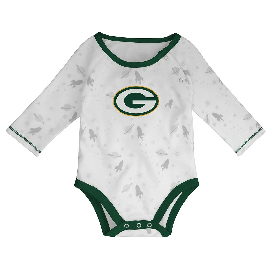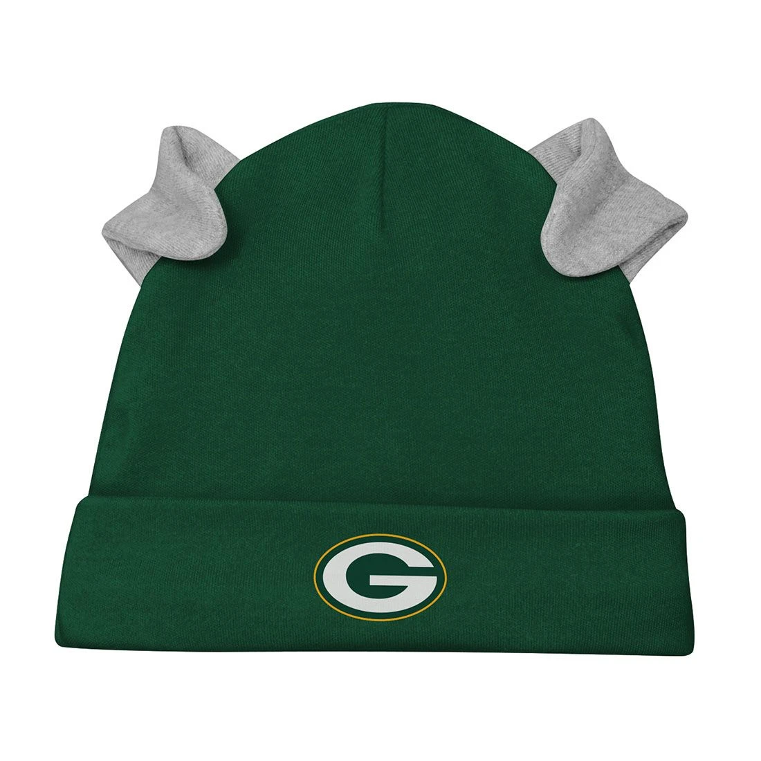Get your kiddo into some official Packers gear with this 3-piece cotton set from Outerstuff. Bodysuit has snaps at shoulder and crotch, raglan sleeves, and printed graphics. Footed pants have elastic waist. Cuffed knit hat has printed logo.