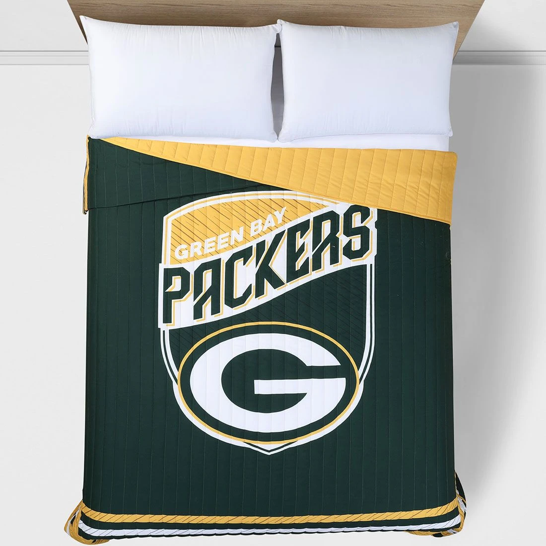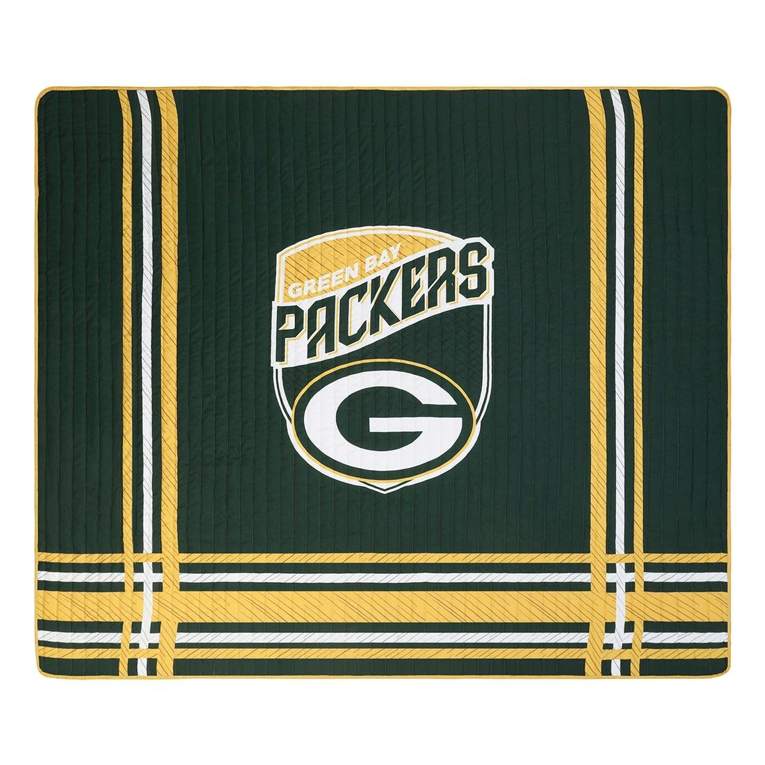The Green Bay Packers Placard Quilt Blanket is the perfect way to keep warm every day and gameday. The solid and clean design, featuring the team colors, allow the iconic Packers logo to take center front on the quilt face. Features 2-inch vertical quilting to evenly distribute filling, prevent any shifting and add additional dimension. Wrinkle and fade resistant printed microfiber polyester shell with down-alternative polyfiber filling is machine washable. Twin/Full blanket measures 88″ x 78″ and Queen/King blanket measures 90″ x 102″. From Cathay Sports.