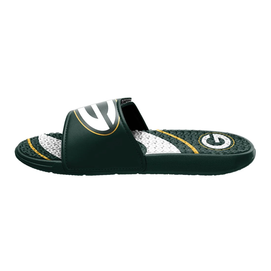 Let their Packers team spirit shine with this gel slide from Forever Collectibles. Slip-on style slide with open-toe design has all-over team colored design with printed team logo on straps. Textured outsole provides non-slip grip, and gel overlay on footbed makes every step feel like a win.