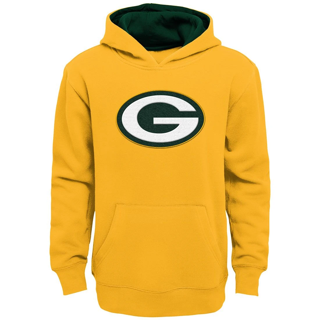 A comfy sweatshirt any young Packers fan will love. Has lined dark green hood, kangaroo pocket, and tackle twill logo. Cotton/polyester. From Outerstuff.